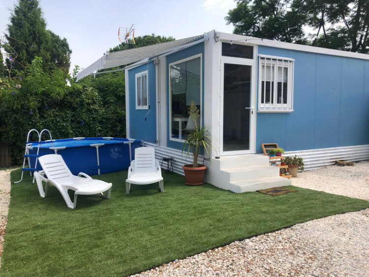 Esta casita está hecha con dos módulos de 6 por 5,44 y una superficie total de 32 metros cuadrados. Consta de un salón, una cocina y un baño completo; también escogieron una amplia cristalera en el salón. El suelo es de tablero fenólico con revestimiento imitación parqué. Instalación eléctrica completa y pintura decorativa en el exterior.