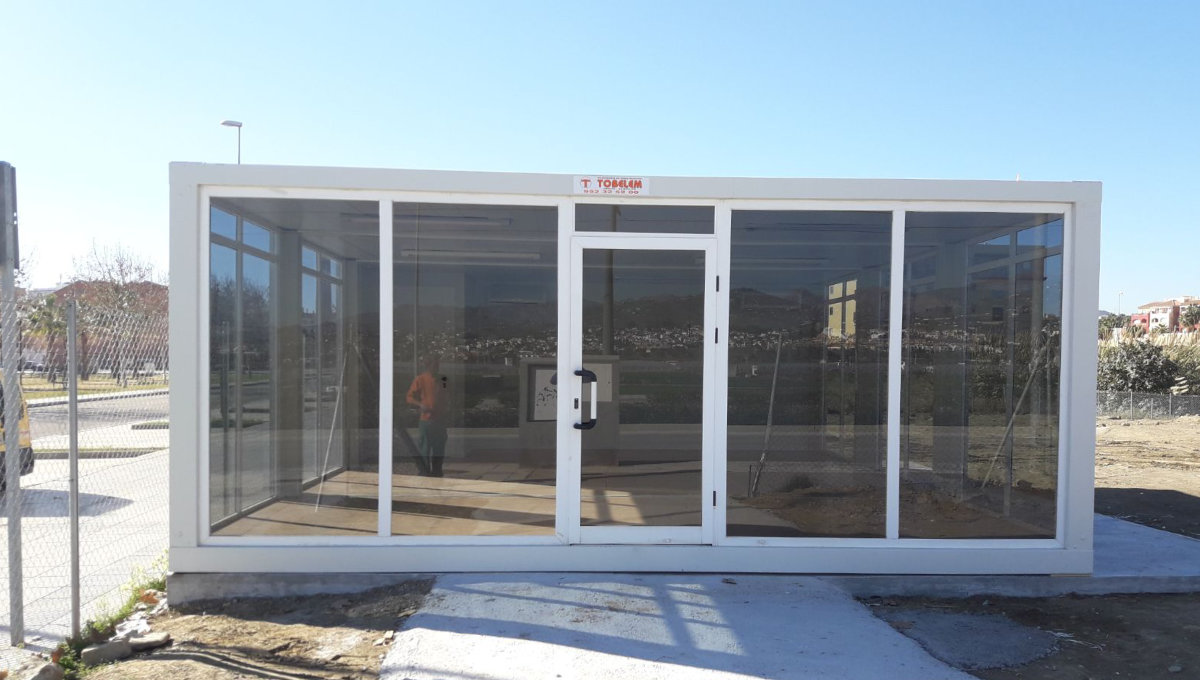 La oficina de ventas cuenta con dos módulos con frontal acristalado y vinilo corporativo.